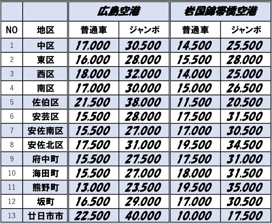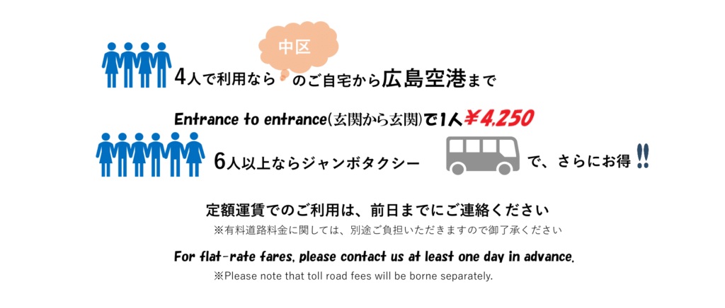 ビジネスや観光に最適な広島空港・岩国錦帯橋空港定額運賃サービスをはじめました!!定額運送は、通常のタクシーのほかジャンボタクシーでもお受けします。